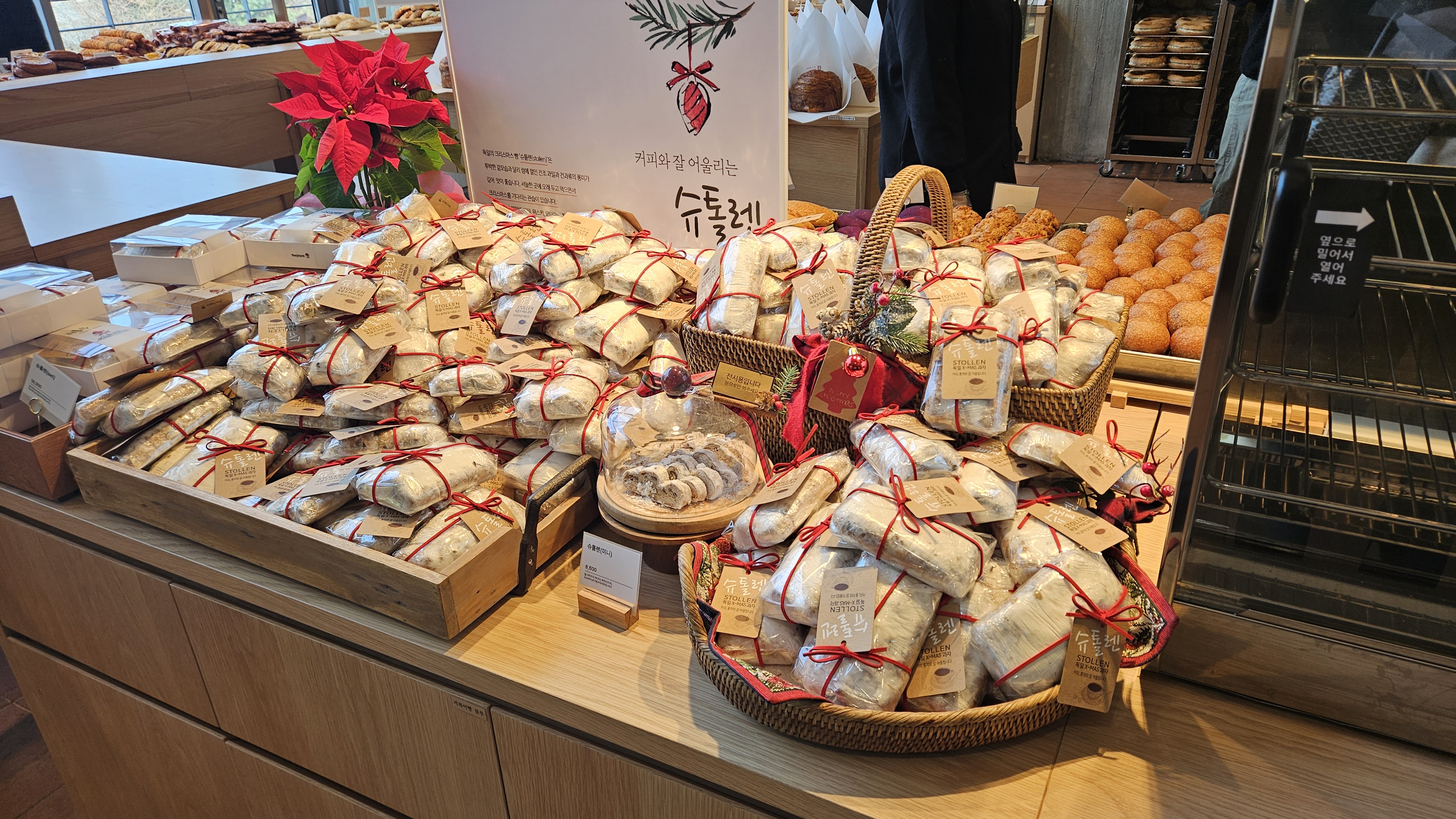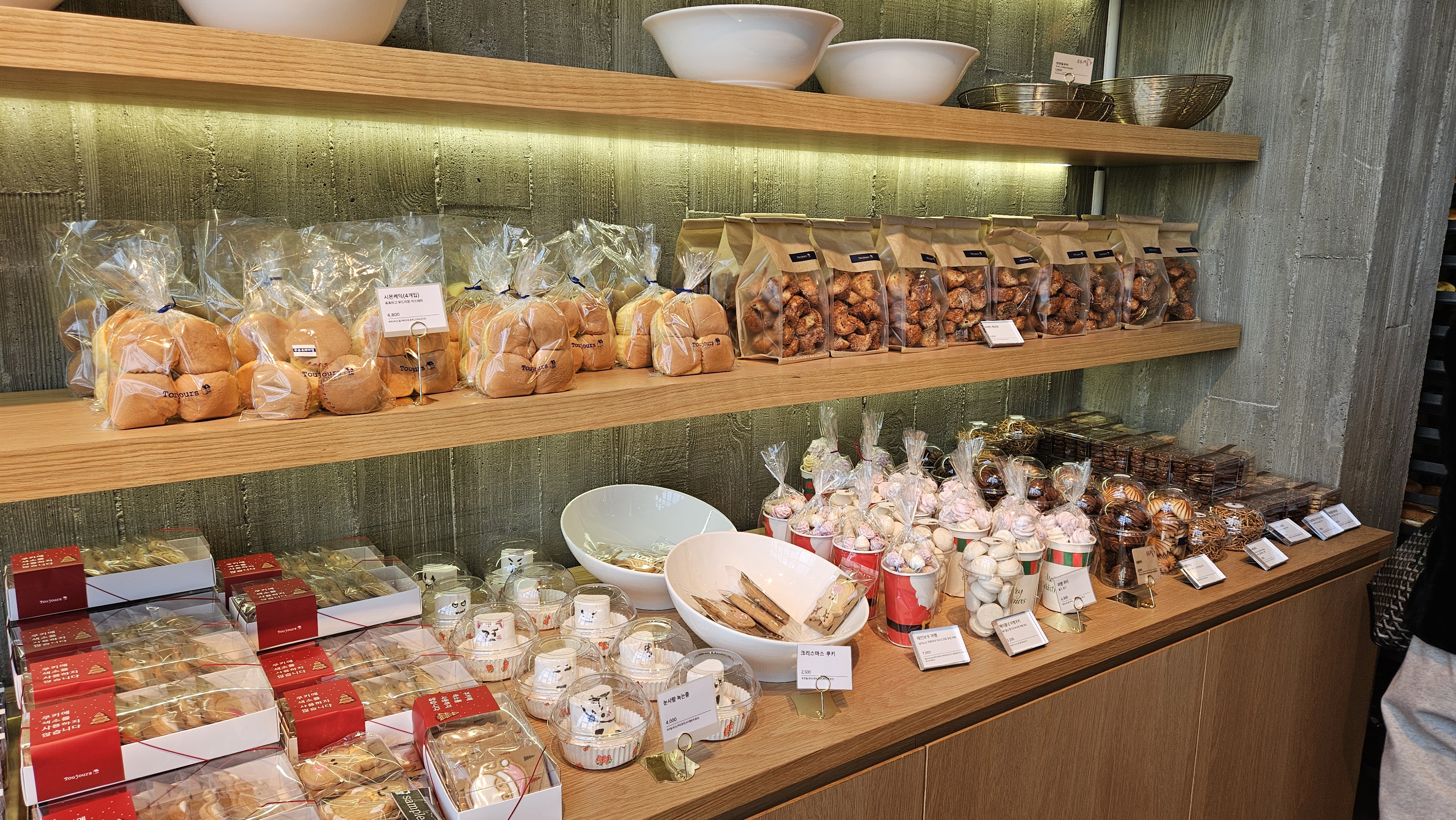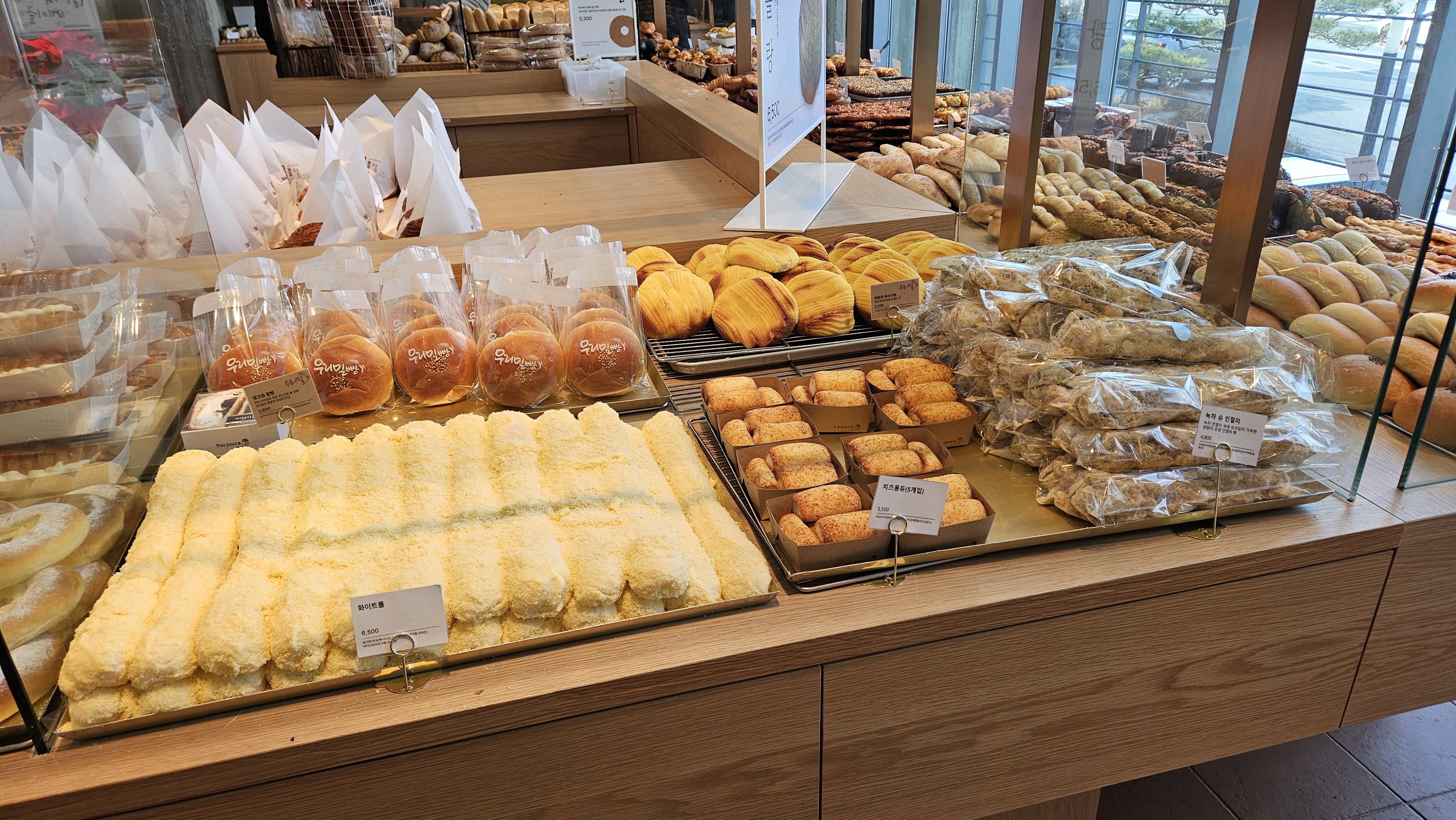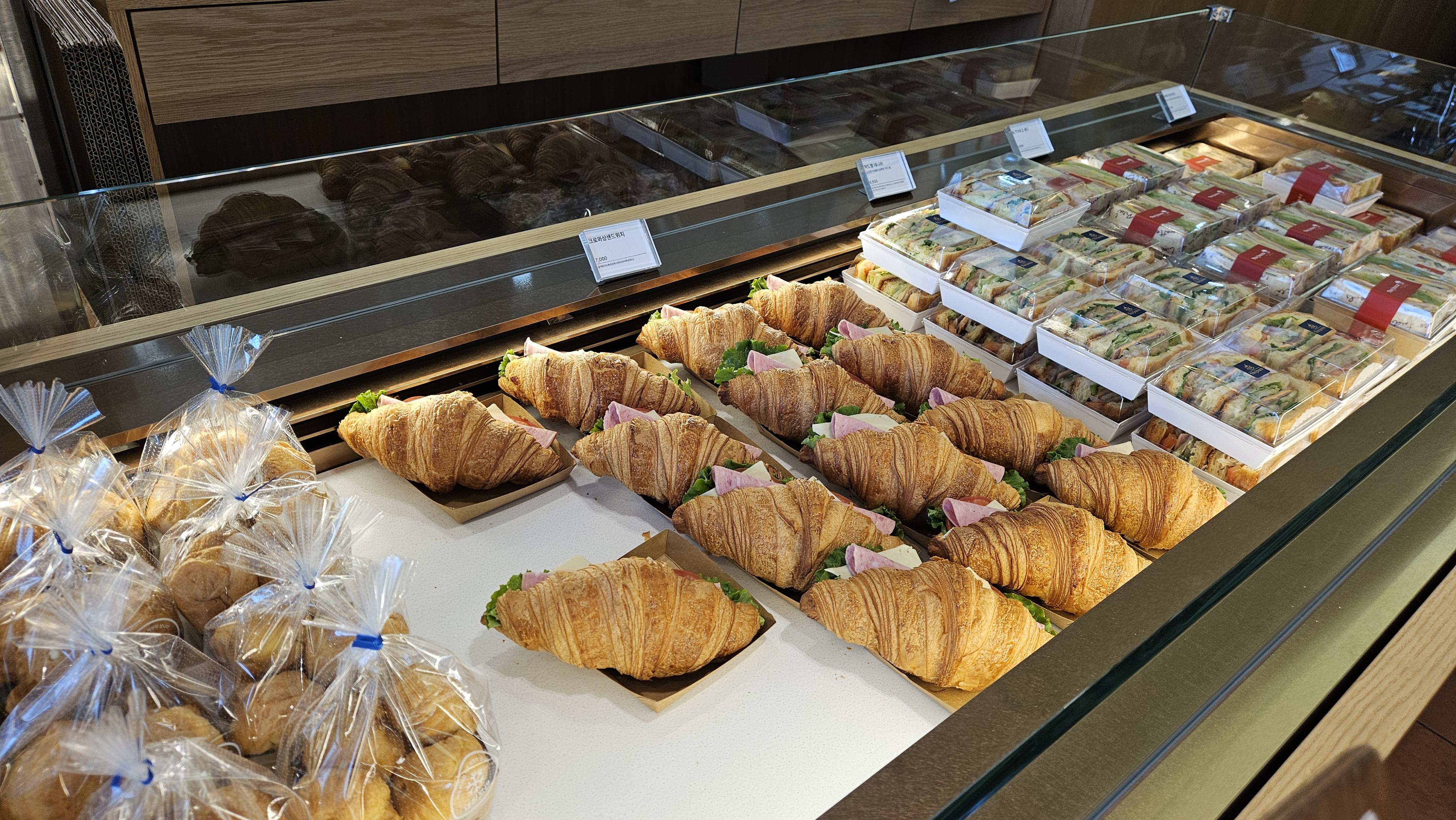 빵 가격은... 어... 성심당 못지않아요... 가격 만만치 않습니다.케익과 선물용 케익은 아까 본 사진의 장소에서 판매합니다. 물론 그게 아니더라도 저것도 맛있어 보임.샌드위치에 크로와상 등 다양한게 많습닏.ㅏ거북이빵은... 그 모카번? 그 맛이라고 생각하시면 됩니다.저건 선물용 슈톨렌...인가 리본 매져있는게 많네요.딸기 컵케익. 5천원이면 저건 나쁘지 않은듯 합니다?잠봉뵈르? 같이 처음 들어보는 빵들도 많습니다.아따 빵냄새 죽입니다... 그리고 맛있어 보입니다.소세지빵에 할라피뇨라니... 아이디어.. 쩝니다. 츄릅...마들렌 쿠키부터 모닝빵? 비스무레까지..우미리 빵이라고 써있는건 단팥빵 같습니다.와 찹쌀떡... 도넛같아보이는 다른빵...