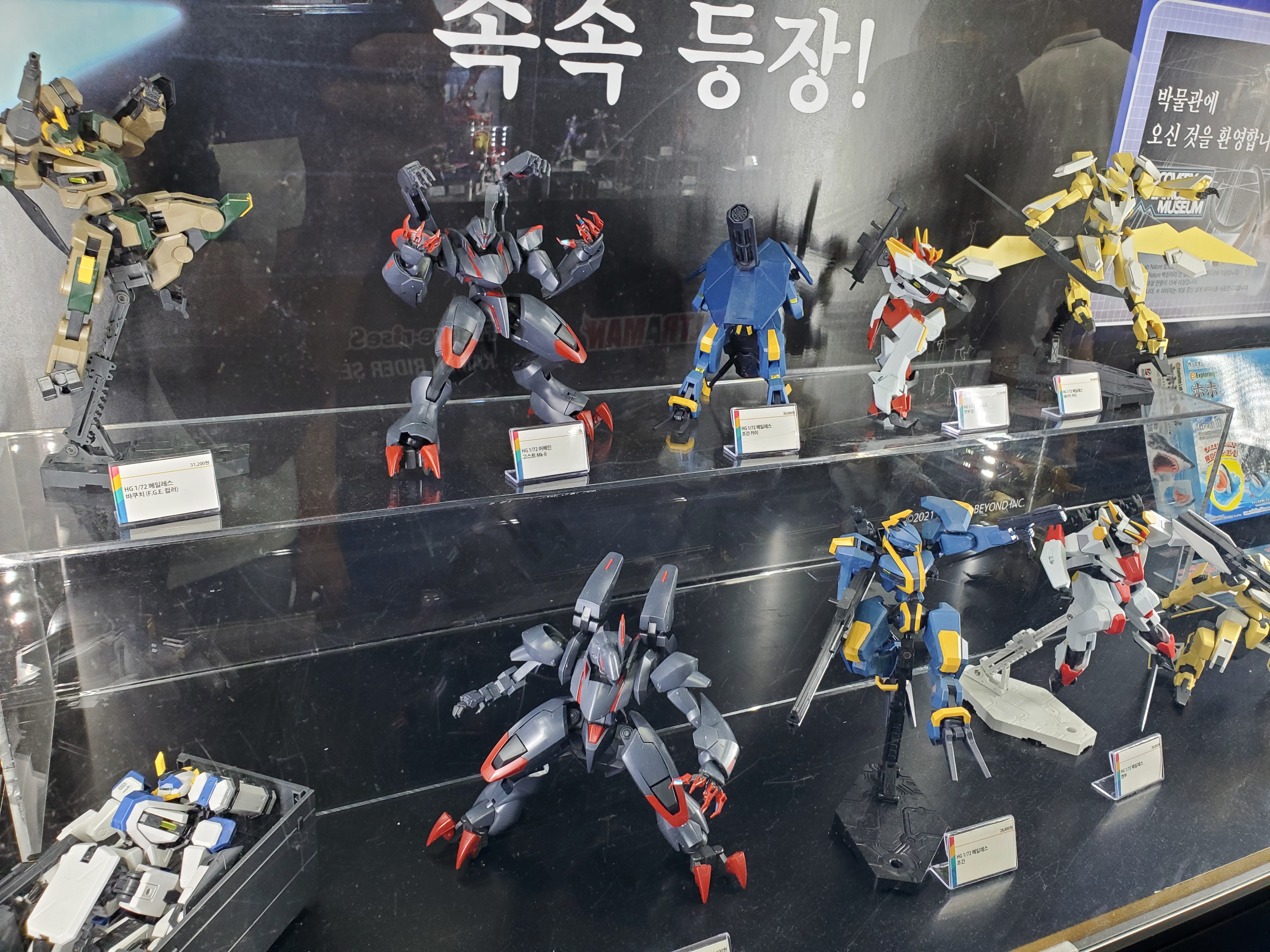 빼곡히 전시된 건프라들. 눈에 띄는건 이클립스 클리어 파츠가 눈에 띄네요.건담 브레이커 등장 기체들도 있습니다. 저 녀석들도 MG로 내줬으면 좋겠다...헬리오스, 브레이징, 퍼펙트 스트라이크 프리덤. 크....가격은 HG답게 매우 착합니다. 하지만 퀄리티는 HG다 보니 좀 떨어지겠죠.뉴가 듀나메스 넘어뜨렸어 ㅋㅋㅋㅋㅋㅋㅋㅋㅋㅋㅋㅋㅋㅋㅋㅋㅋㅋㅋ데스사이즈 EW 버전도 눈에 띄고 잔라이져도 눈에 띄네요.마지막 장식장. 제가 조립했떤 이클립스와 하이뉴 외 있습니다. 아래 360,000원 세트는 뭔가 많아보이는데...