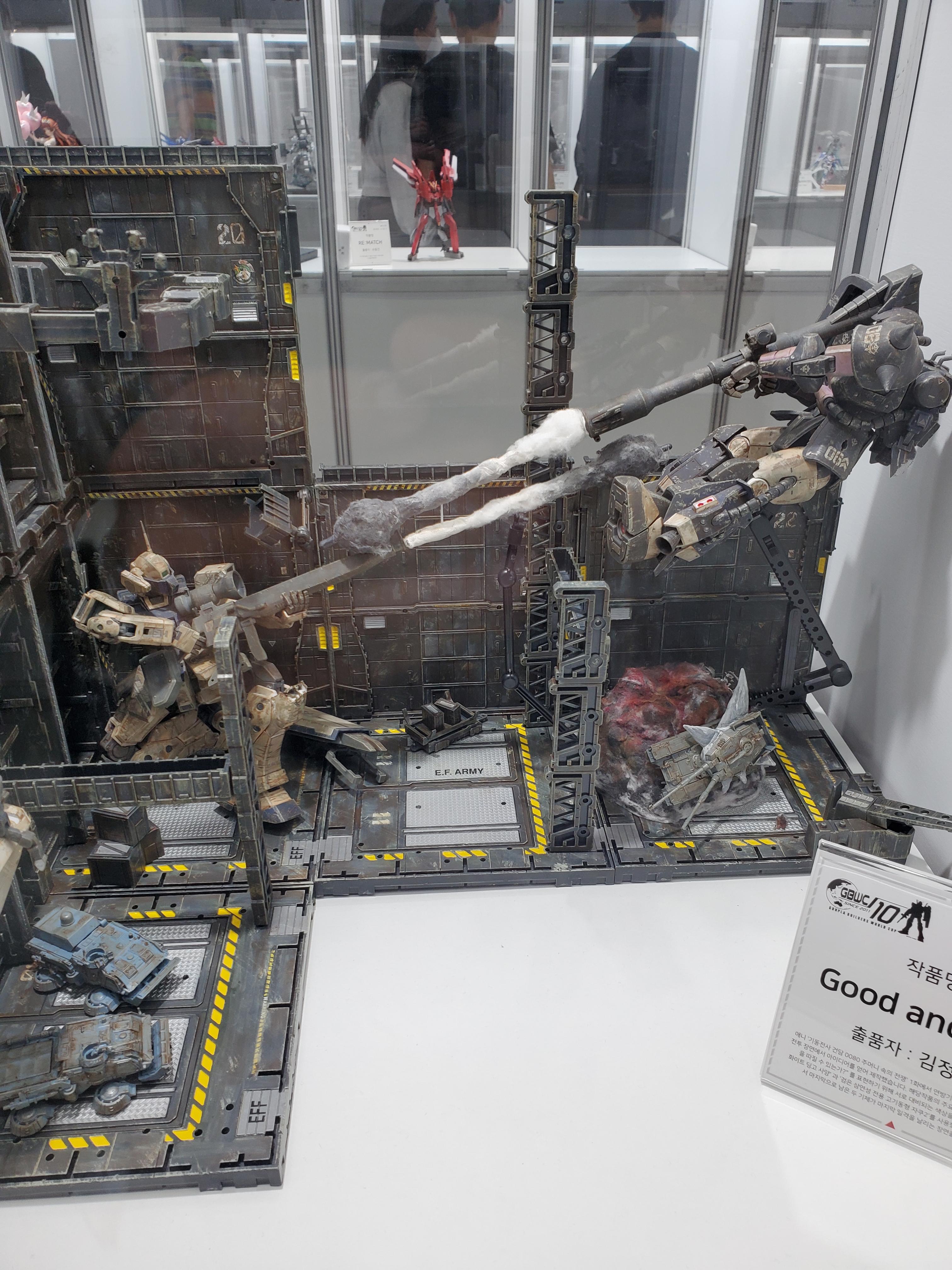 건담 유튜브 1인자 제룡. 추첨을 하고 있더군요. 건담 전시장에서 저런 유명인이 있는걸 보고 진짜 얼마나 큰 행사인지 다시 깨달았습니다.월광접 하이뉴라고 합니다. 핀 판넬을 이용해서... 아이디어 멋집니다.뉴건담을 이긴 사자비. ㅋㅋ 원작과는 다른 결말이지만 뉴건을 아작을 내놨네요 ㅋㅋ바주카 발사 연출... 솜으로... 굳굳유니콘과 밴시를 진짜 교묘하게 딱 절반씩 섞어놓은 녀석. 진짜 절반 작업... 완벽하네요.무지개색 문건담?! ㅋㅋ티탄 컬러로 맞춘 프리덤랍니다. 눈 색상을 조금 더 포인트를 줬음 어땠을까 생각이...이게 내가 조립한 에피온이라고??? 이 도색이 훨씬 더 멋지네요. 미쳤다... 진짜...90개의 핀판넬을 장비한 뉴건담. 노가다...와...뭔지 모르는 짬뽕기. 이것 저것 다 섞여있는 것 같은데, 짐작도 안가네요.샌드록과 마그아낙 부대. 노가다에 정성이 와...블루/골드 컬러의 페넥스 리베르타. 리베르타가 프라로 나왔던 건 기억하는데, 이런 색상으로 나오니 완전 다른 기체인줄 알았네요.제가 봤던것중 1등을 뽑으라면 단연코 이녀석을 뽑겠습니다. 아스트레이라는데 진짜... 얘 애니에 나왔으면 할 정도의 임팩트간지, 조형, 도색 등 진짜 모든게 완벽하다고 생각된 녀석. 개멋져요!!!!서로 바꾼 사자비와 뉴건담 ㅋㅋㅋ 뉴건담에 판넬, 사자비 핀판넬? ㅋㅋㅋㅋ건담W 5인방. 엔들리스 왈츠 쓴건 그냥 직접 쓰지 말고 인쇄해서 썼으면 더 완벽하지 않았을까 싶네요.